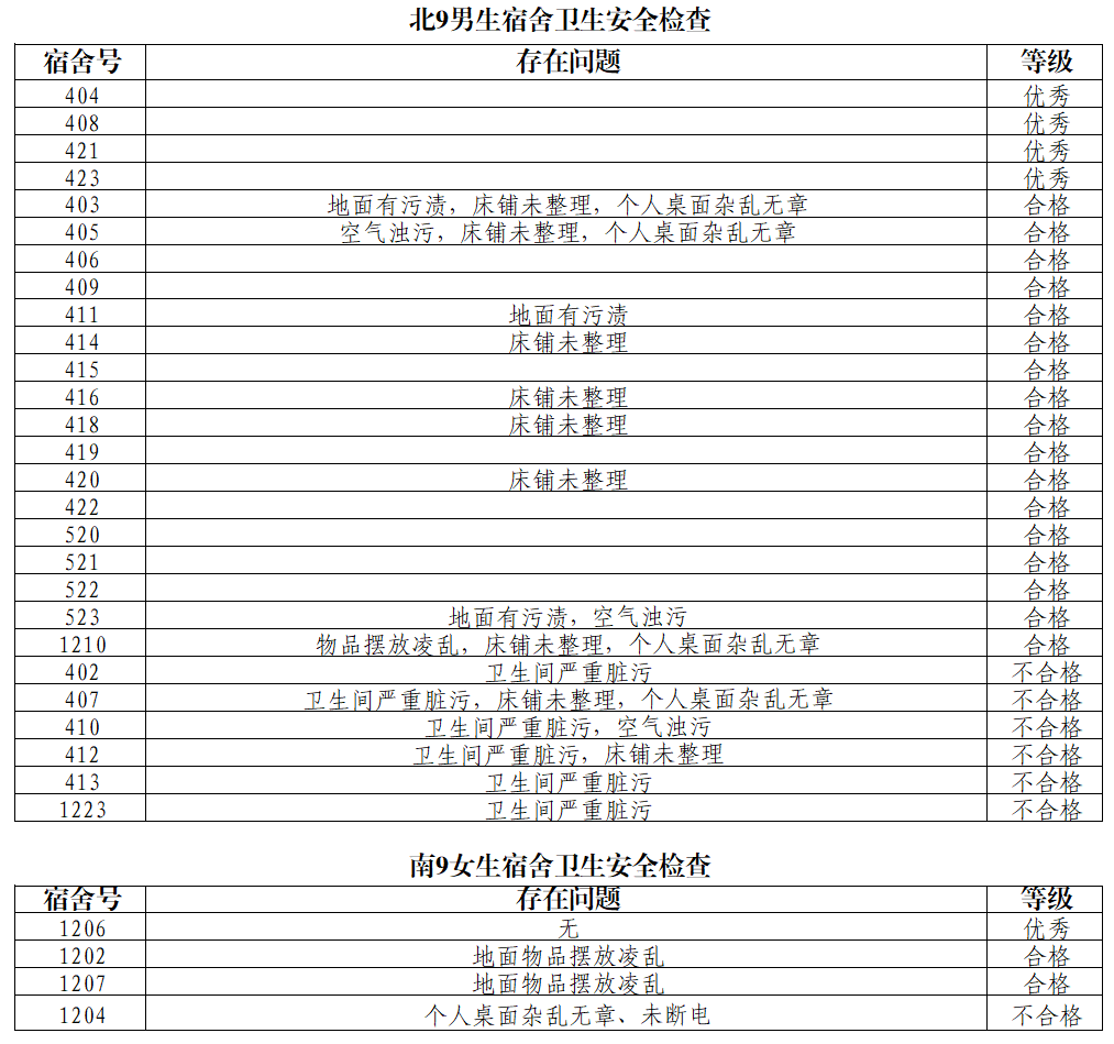为深入贯彻落实上级关于安全工作的指示精神,加强学生宿舍内务卫生和安全文明创建,强化学生宿舍安全意识,营造一个安全舒适、整洁优雅、文明和谐的宿舍环境。4月17日,学院分管领导、学院研究生会开展了学生宿舍卫生安全秩序大检查。本次共抽查研究生宿舍31间,经统计,优秀宿舍5间,合格宿舍19间,不合格宿舍7间。
